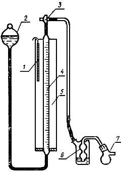 1 - термометр; 2 - груша уравнительная; 3 - кран трехходовой; 4 - бюретка газовая; 5 - кожух стеклянный; 6 - склянка Дрекселя; 7 - колба реакционная